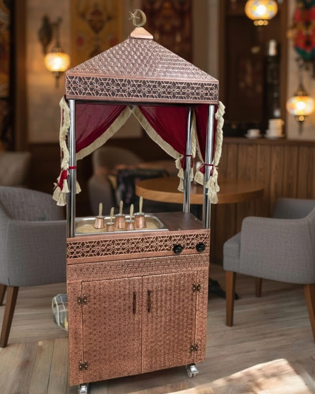 Alt dolap bölmesi ekipman saklama kolaylığı sunarken tekerlekli gövde yapısı, ürünü etkinliklerde, kafelerde, restoranlarda veya açık alanlarda kolayca konumlandırmanızı sağlar. Şık bakır işlemeli yüzeyi ise sunum alanına otantik bir hava katar.