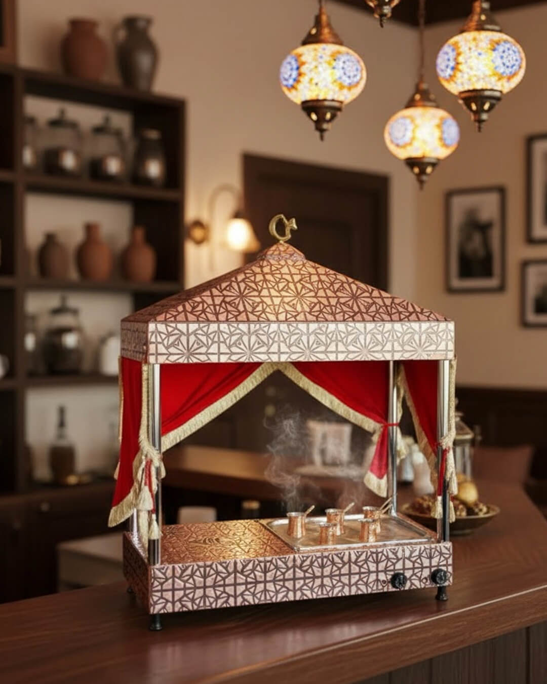 Osmanlı esintili kubbe yapısı, bakır işlemeli gövdesi ve kırmızı perde detaylarıyla Davlumbazlı Kumda Kahve Makinesi, sunum alanlarında hem görsel bir şov hem de profesyonel bir pişirme performansı sunar. Entegre davlumbaz sistemi, pişirme sırasında oluşan buharı yukarı çekerek temiz, düzenli ve hijyenik bir kullanım sağlar.