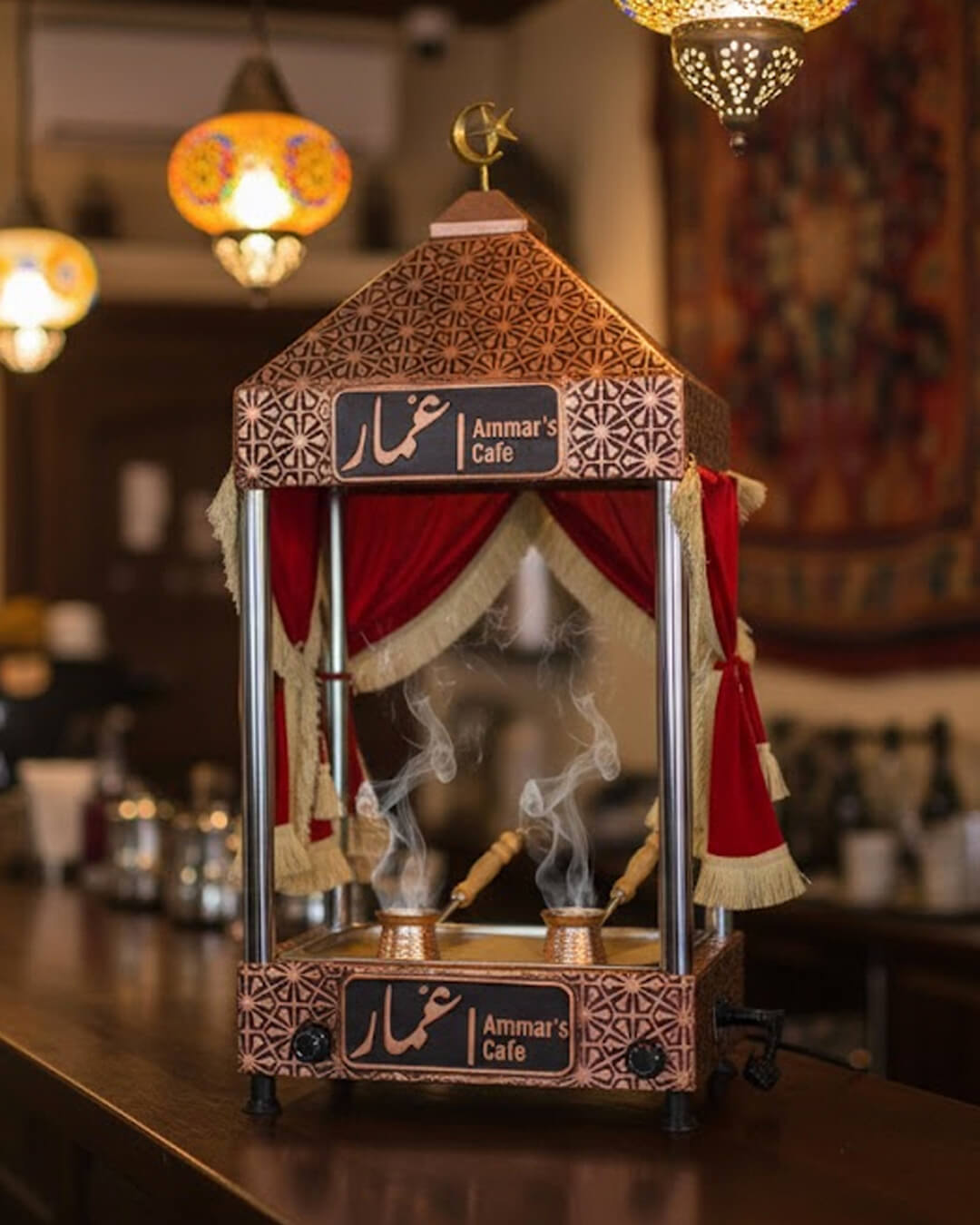 Gösterişli kubbe başlığı, perde detayları ve bakır işlemeli yüzeyiyle öne çıkan Davlumbazlı Kumda Kahve Makinesi, kumda kahve deneyimini hem şık hem de daha kontrollü hâle getirir. Entegre davlumbaz yapısı sayesinde pişirme sırasında oluşan buhar ve ısı yukarıya toplanır, kullanım alanını daha temiz ve düzenli tutar.