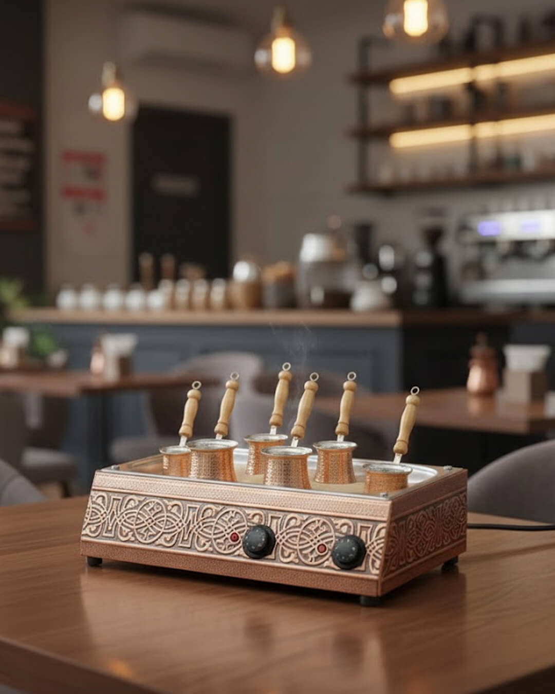 El işçiliği bakır desenleri ve kompakt tasarımıyla İki Gözlü Kumda Kahve Makinesi, kumda kahve hazırlamak isteyen işletmeler için hem şık hem de verimli bir çözümdür. Çift gözlü yapısı sayesinde aynı anda birden fazla cezveyle çalışabilir, güçlü kum ısıtma sistemi kahvenin eşit ısıda pişmesini sağlar. Böylece bol köpüklü, köz lezzetinde kahveler elde edilir.
